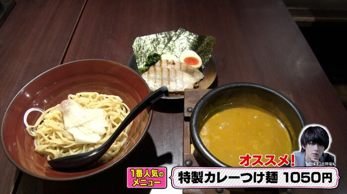 設楽さんは、「おいしー!。牛乳が入っていて、(つけ汁が)クリーミですね。特注の麺もしっかりして、おいしいです。カレーとつけ麺の融合が見事です」と称賛。