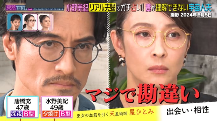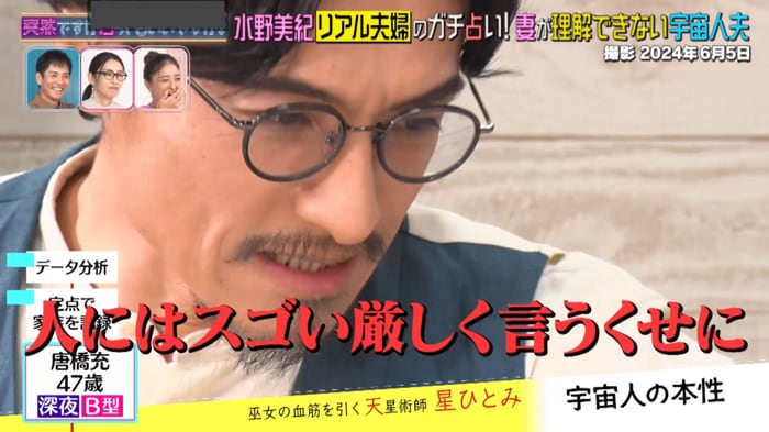 水野さんの証言と星さんの占いにより、“宇宙人夫”唐橋さんの素顔が次々と明らかになりました。