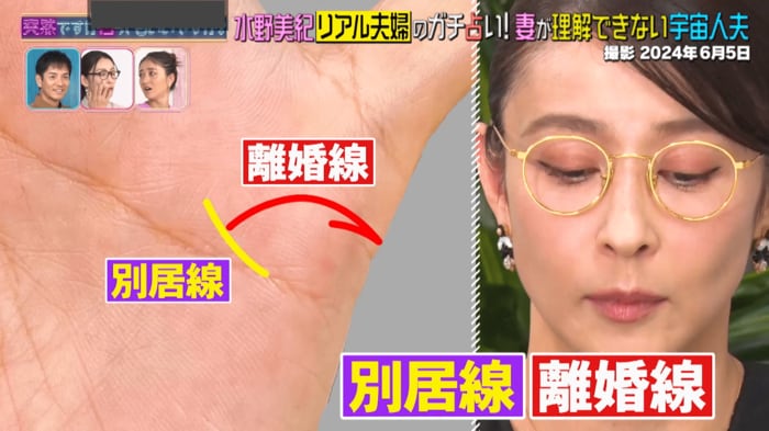 ここで水野さんの手相を見ると、別居線、離婚線が出ていることが判明。