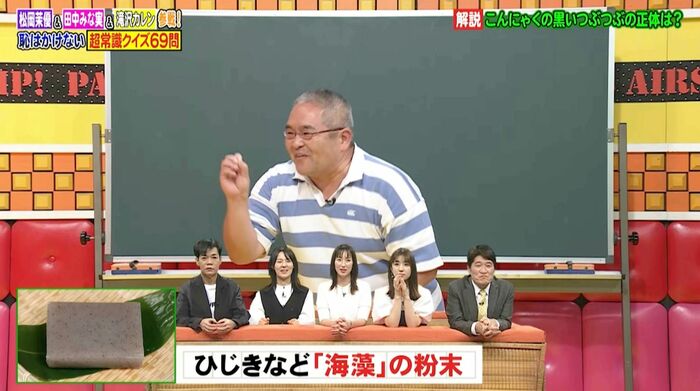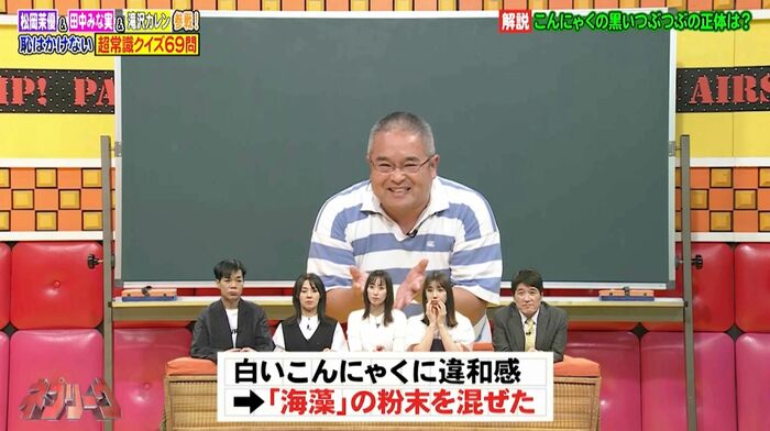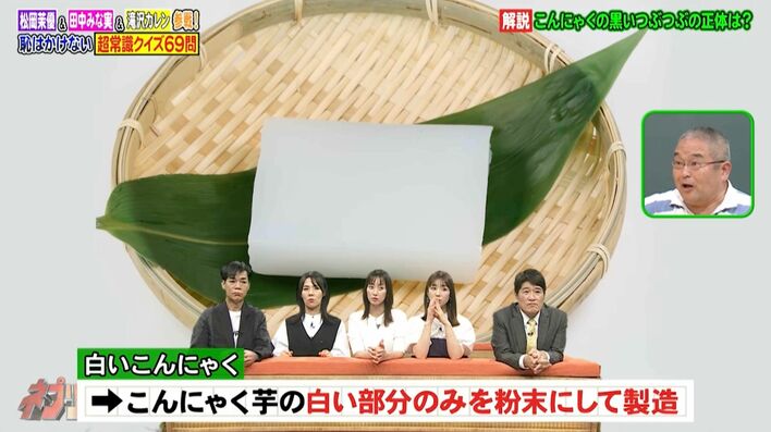 群馬県のこんにゃく芋の収穫量が全国で占める割合(95%)を答える問題では、地理担当の村瀬哲史先生がこんにゃくの「黒いつぶつぶ」の正体について解説しました。