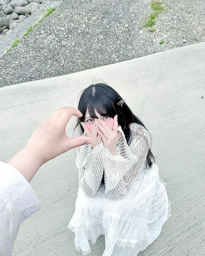 投稿された写真では、片手で半分のハートを作った「片思いハート」の奥で、白のワンピース姿でちょこんとしゃがんでいるむめいさんが、顔を手で覆ってカメラを見つめる姿が!