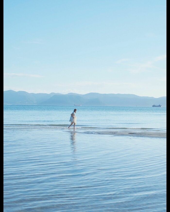 また、カメラから遠く離れ、一面さわやかなブルーカラーの海が広がる浅瀬を歩いている様子や…