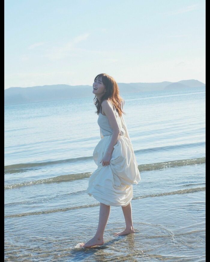 スカートの裾を持ち上げ、はだしで海辺を歩いており、満面の笑顔を浮かべていることから、楽しそうなのが伝わってきます。