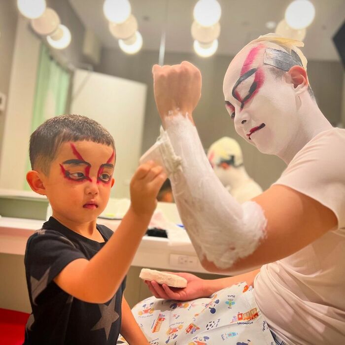 また、息子の陽喜くん(6)、夏幹くん(4)とともに舞台化粧をする様子などを公開。