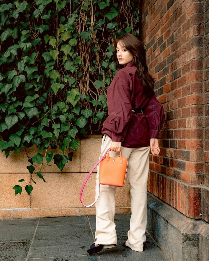 バーガンディのジャケットを羽織ったコーディネートで大人の雰囲気があふれた姿を披露しました。