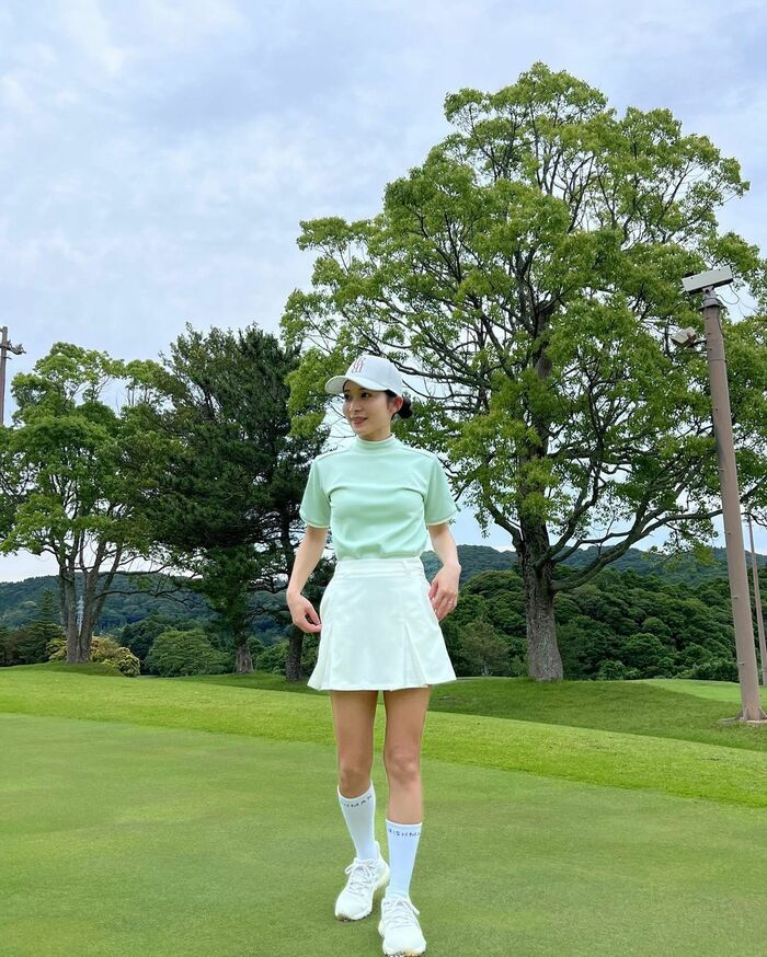 山本さんは「先月ゴルフに行った時」というコメントを添えて、淡いグリーンのトップスに白のミニスカート、キャップ、、ハイソックス、スニーカーで揃えたゴルフウェア姿の写真を複数公開。