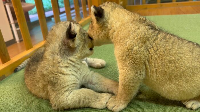 右側にいる1頭の赤ちゃんライオンが、目の前にいるもう1頭の目のあたりをペロっと毛づくろい。