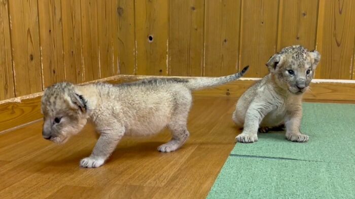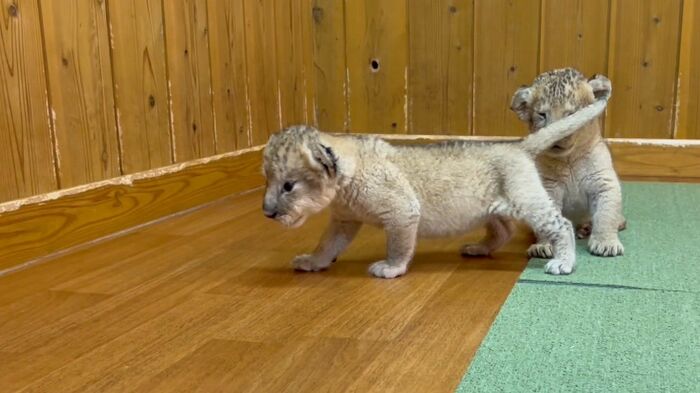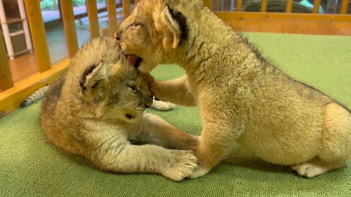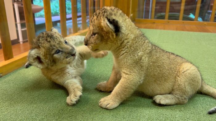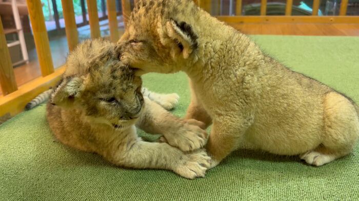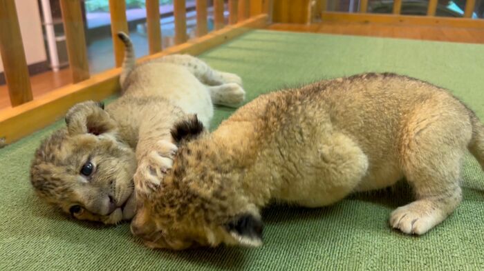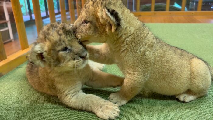 ある日の動画では、2頭のライオンの赤ちゃんがじゃれ合う姿が。