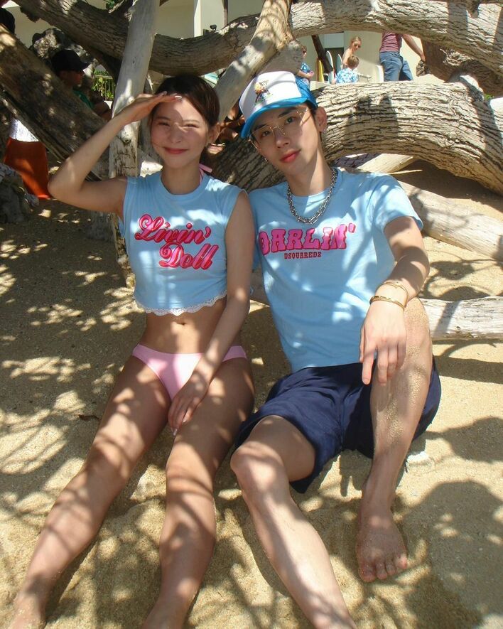 他にも、弟のよしあきさんと同じ水色のTシャツで色を合わせたコーデで、ビーチの砂浜に座って笑顔を見せるツーショットや、