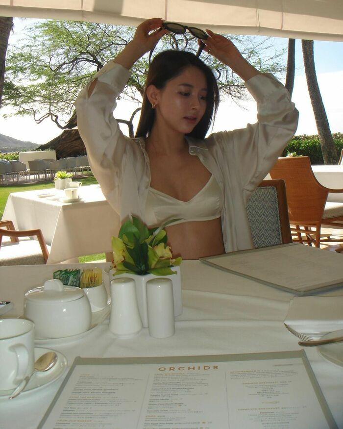 海を背景に、白いビスチェにシャツを羽織り、お腹を大胆に見せたホワイトコーデも披露!