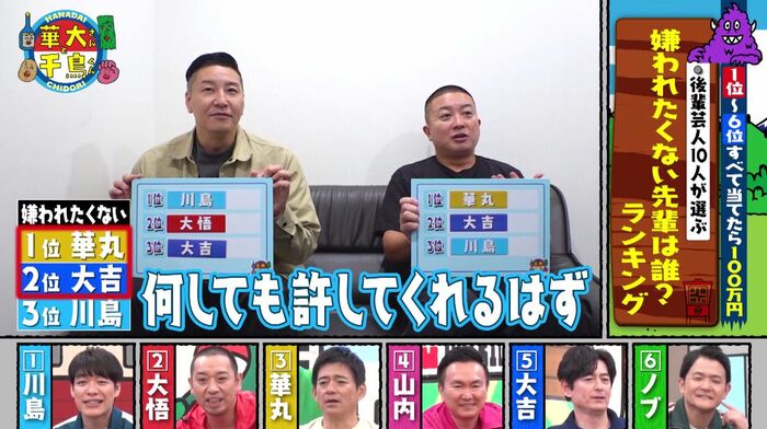 松尾さんが「華大さんはやさしいし。何しても許してくれるはず。そんな2人に嫌われるのは、なんかイヤ」と語ると、スタジオは「そういうことだ!」(川島)、「やっぱ人情だ!」(ノブ)と反応しました。