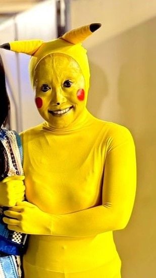 全身黄色一色で、顔もしっかりとペイントし、カメラに向けてほほ笑んでいる『ポケモン』の実写版「ピカチュウ」の姿も!