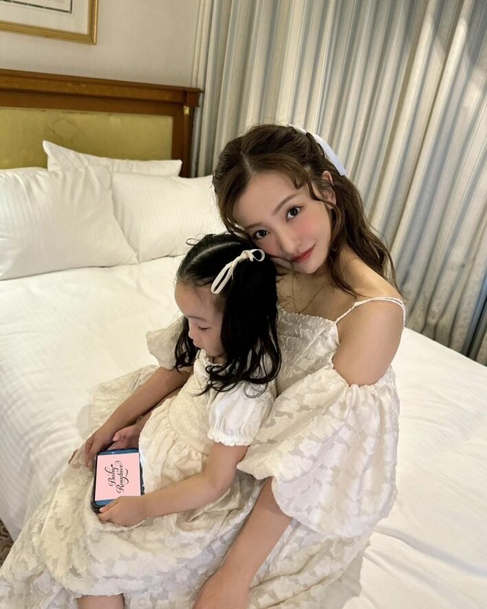 投稿された写真には、白いオフショルのトップスとスカートのセットアップを着た板野さんが、膝の上に2歳の娘を乗せて顔を寄せている姿が!