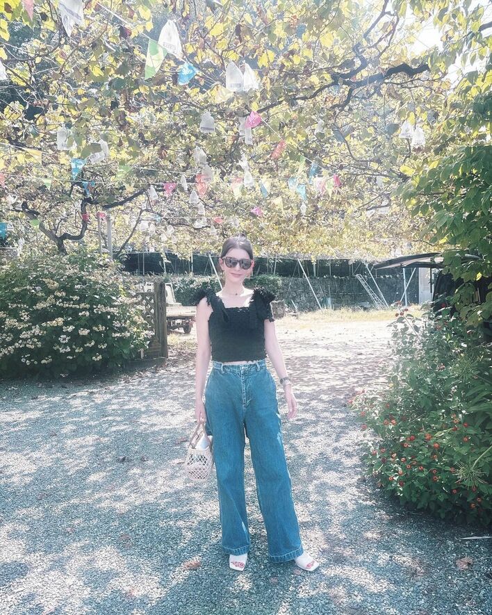 自然に囲まれた場所で披露したカジュアルコーデは、上は黒のリボンストラップのトップスに、下はデニムのパンツになっていました。