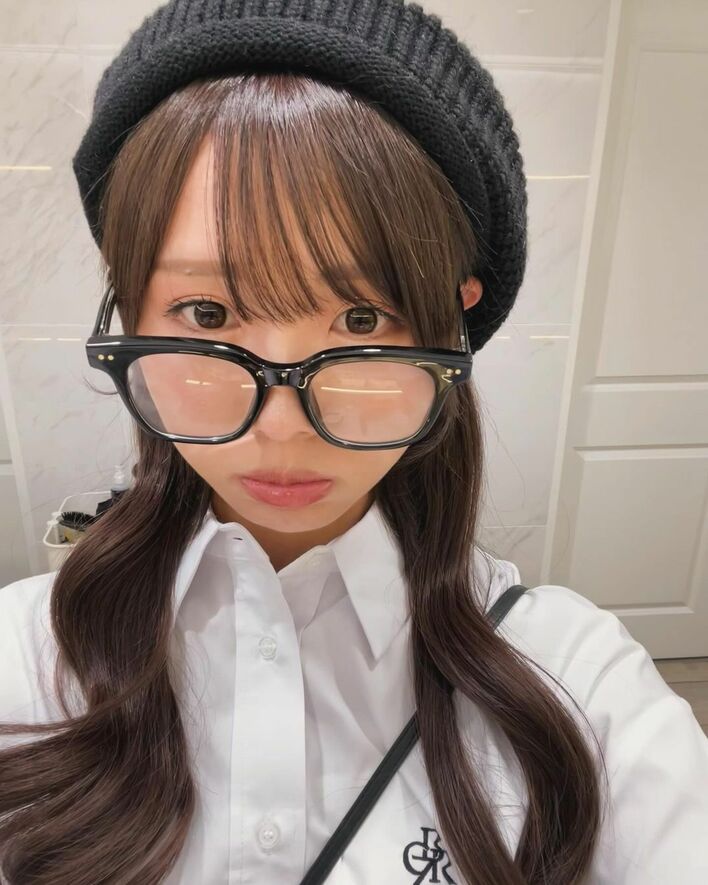 黒のメガネを少しずらしたあざとい姿を見せています。