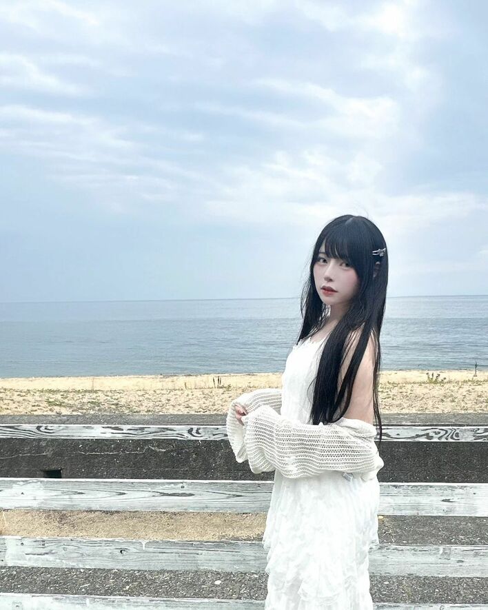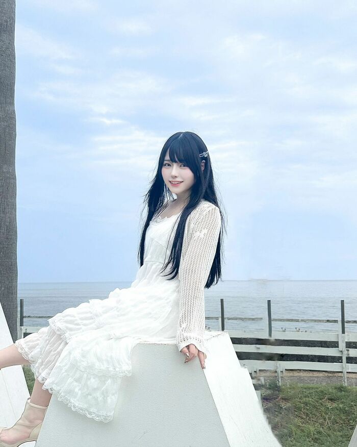 投稿された写真では、淡路島の海を背景に、白のふんわりしたワンピースにカーディガンを羽織ったむめいさんが、オブジェに座りカメラに向けてほほ笑んでいる姿が!