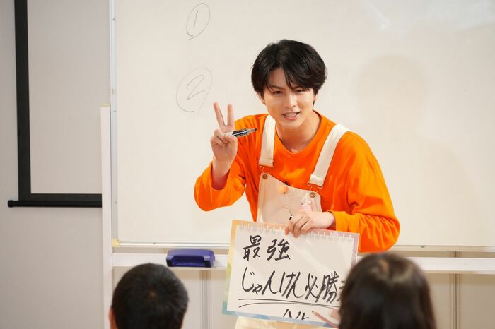 ハル先生は、リョウガさんが授業で話した「自分が出した手に負ける手を出すと勝ちやすい」という「ジャンケン必勝法」を全否定するところから授業を開始。「最強ジャンケン必勝法」をテーマに掲げ、「さっきの元気は?」「来いよもっとみんな!」と子どもたちを盛り上げます。
