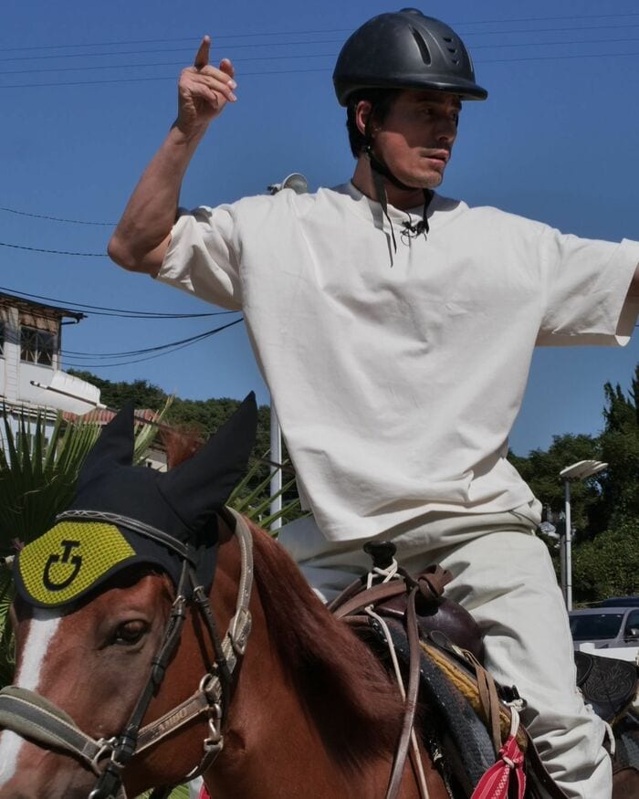 公開されたショットには、海をバックに、茶色い馬に乗る伊藤さんの凜々しい姿が!