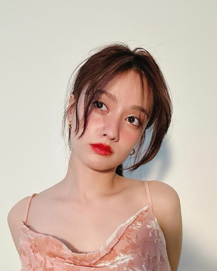 ピンクのキャミソールワンピースを着用し、ヘアスタイルは無造作に1つに結んでいます。