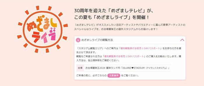 毎年恒例の『めざましライブ』では、屋外特設会場「冒険ランド」内に設置された開放感のある大型スタジアムで人気アーティストたちが熱いライブパフォーマンスを披露します!