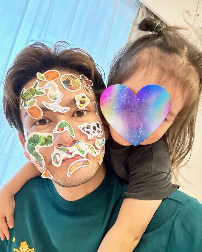 昼寝から目覚めたときのエピソードを明かし、顔が「はらぺこあおむし」で埋め尽くされた姿での娘とのツーショットを公開しました。