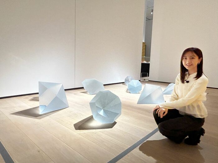 ポケモンの技をインスタレーションに仕立ててしまったのは新實広記さん。テーマに選んだのは大きな氷柱を落として攻撃する「つららおとし」。氷を表現するのにガラスが使用されています。佐久間アナは、「半透明だったり、透明だったり、角度を変えて色々な方向から見ると、このアート作品のいろいろな表情を楽しめますよ」と興味深げにのぞきこんでいました。