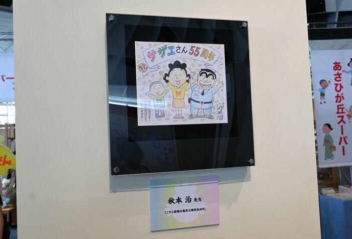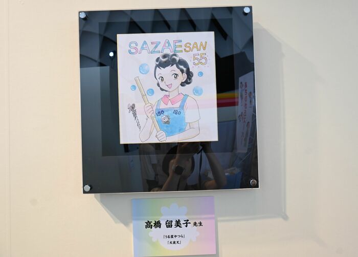 「“あなたの街”と“サザエさん”絵画コーナー」では、視聴者、著名人、作家、クリエイターから公募したイラストを展示。ここには視聴者が自身が暮らす街の風景とともにサザエさん一家を描いたイラストのほか、『こちら葛飾区亀有公園前派出所』の秋本治先生や『ONE PIECE』の尾田栄一郎先生、『タッチ』のあだち充先生、『うる星やつら』の高橋留美子先生など有名作家が描いたサザエさんも。
