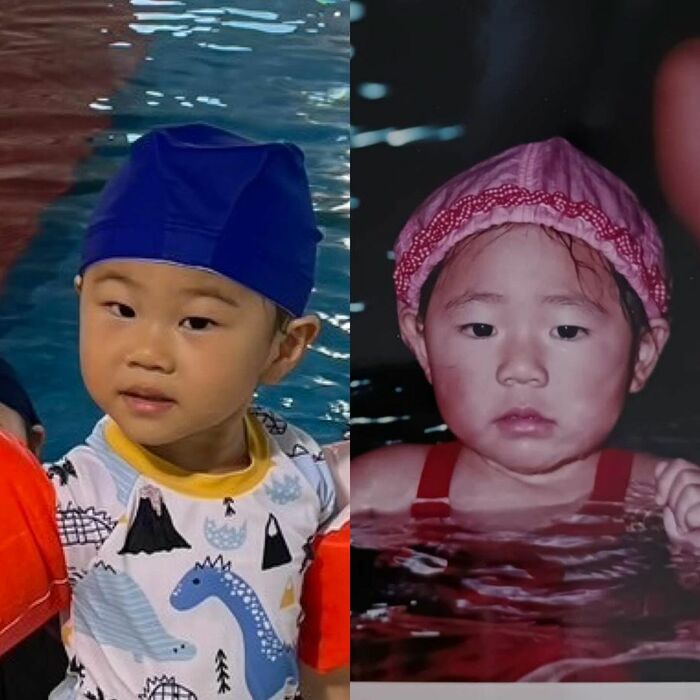 さらに「実は母ちゃんもイトマンに通ってたんだぁ だから今も泳ぐの大好き」と、青い水泳帽をかぶりカメラ目線のやさ丸くんと、ピンクの水泳帽をかぶりプールに浸かる自身の幼少期の写真を並べて公開。