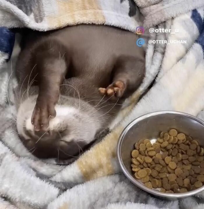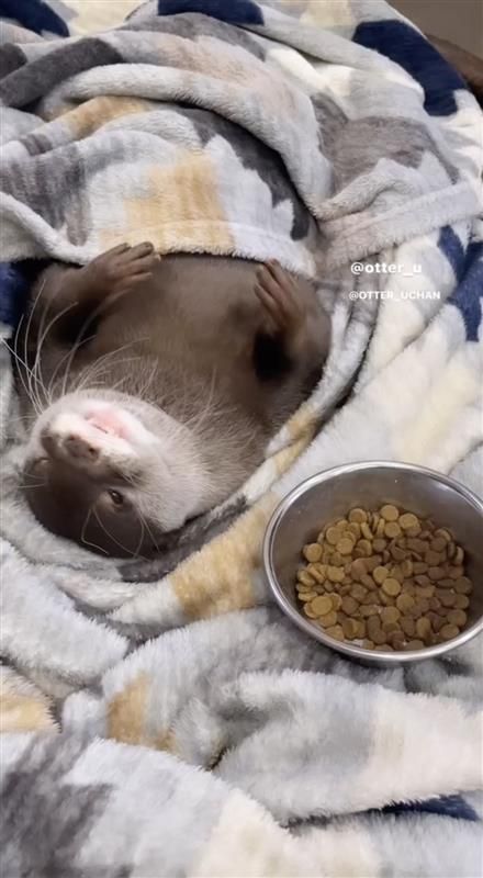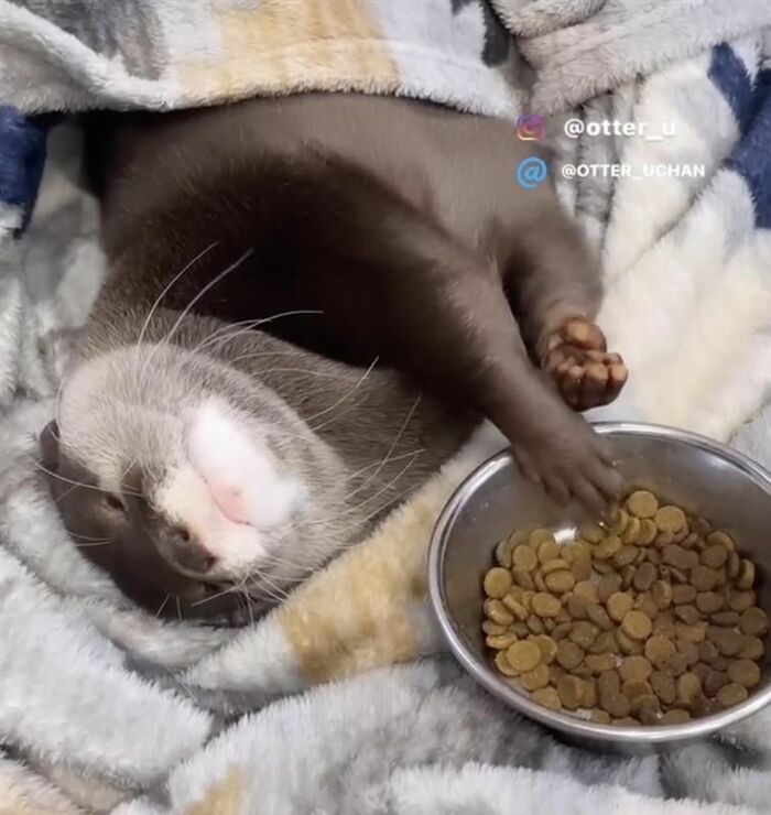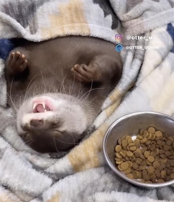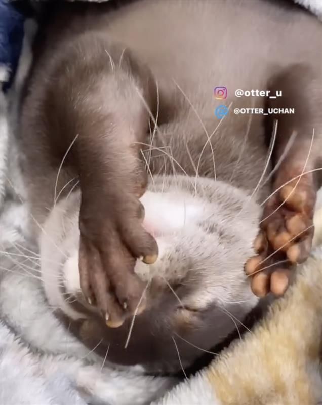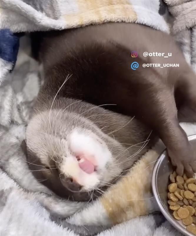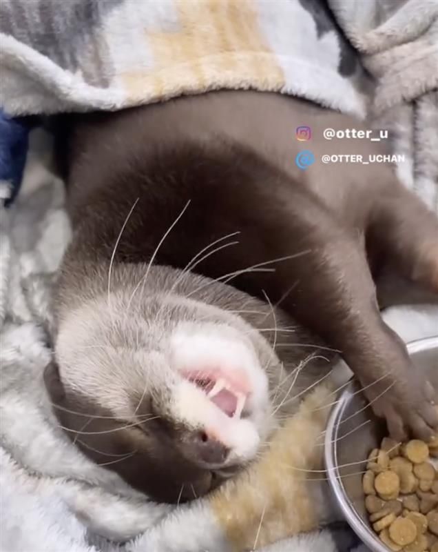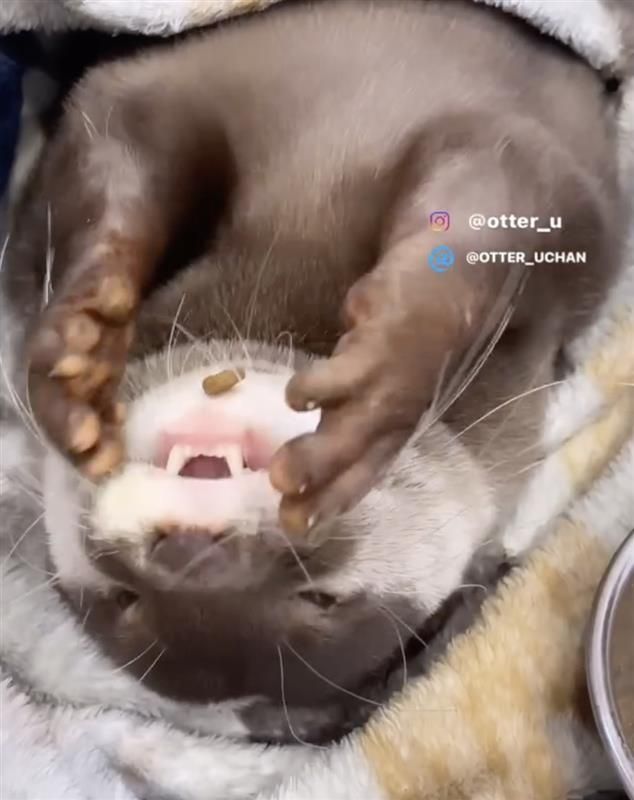 カワウソのウーちゃん 寝ながらモグモグ