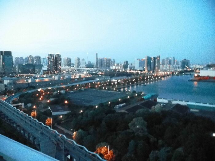 こちらは、フジテレビのスタジオから東京・臨海エリアを臨む風景写真。太陽が落ちて空は深い青色に染まり始め、街には街灯やビルの光がキラキラと輝いています。刻々と変わる宵の空を切り取った、素敵な1枚です。