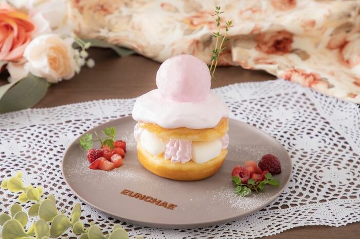 ストロベリーミルクアイスやマシュマロ、ホイップクリームをサンドしたドーナツ。