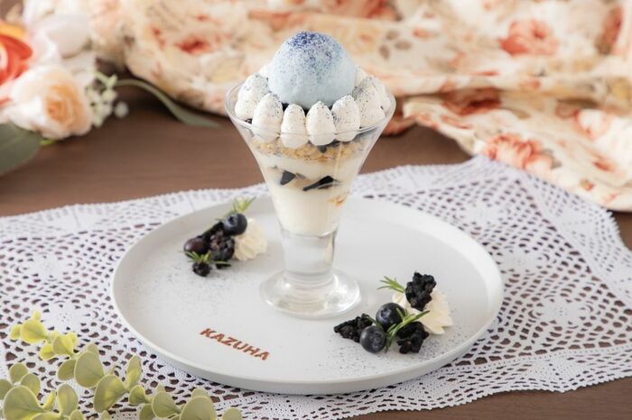 ブルーソルトアイスやコーヒーゼリーをトッピングしたパフェ。