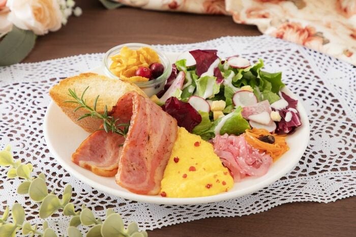 野菜やベーコン、スクランブルエッグなどのデリを中心としたブランチプレート。