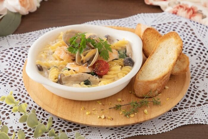 あさりやえびなどの魚介や、野菜が入ったクリームスープパスタ。