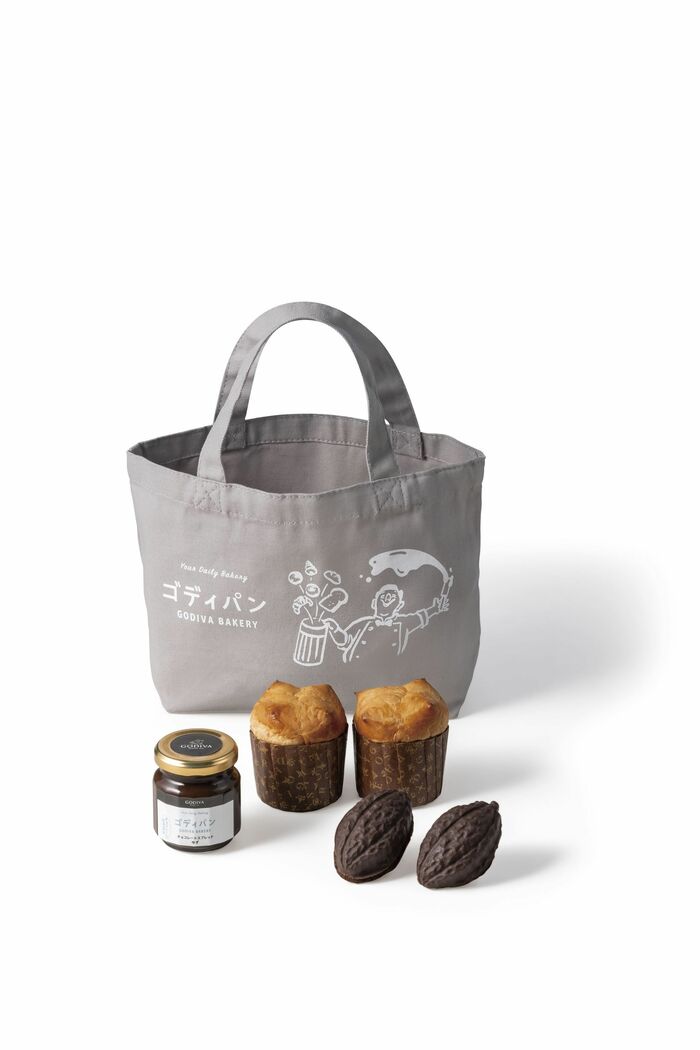 また、「ゴディパン」の誕生1周年記念として、ライトグレーのトートバッグに人気商品のカカオケーキ(2個入)・チョコレートスプレッドゆず・ミニパン(2個入)が入った「ゴディパン 1周年記念トートバッグセット※期間限定、1日100個限定」(3240円)と、メロンパンのイラストが入った「ゴディパン 1周年記念エコバッグ※数量限定」(1320円)も期間限定で登場します。