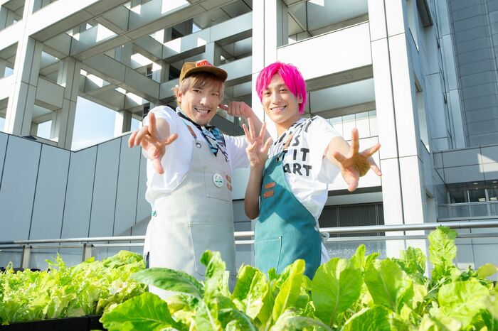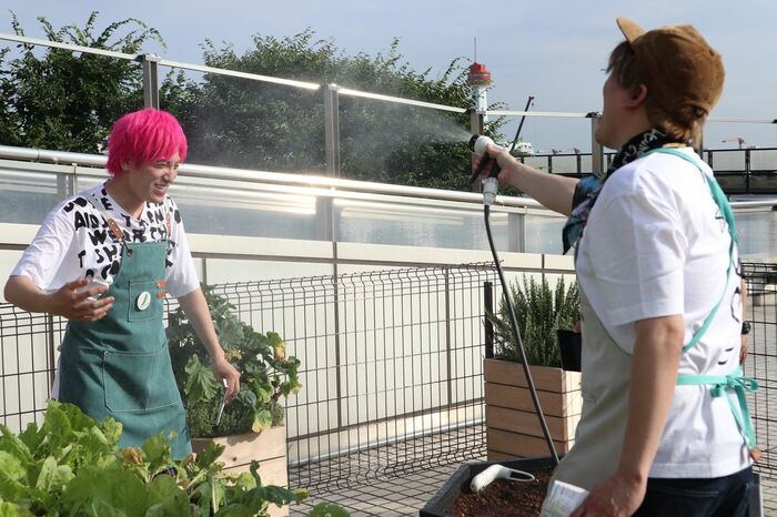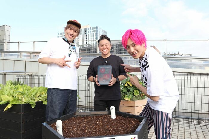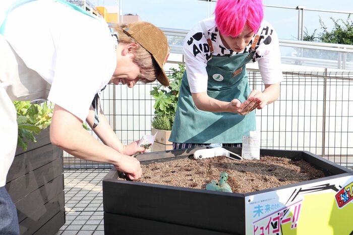 EXITが、フジテレビ社屋に設置された農園「アクションお台場ファーム」で野菜の種まきを行いました。
