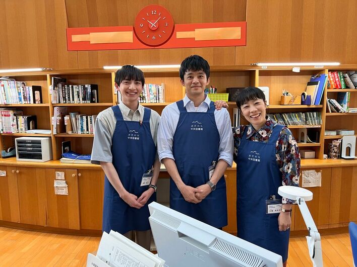 図書館のセットで、津野晴明役の池松壮亮さんを真ん中に、左に川﨑皇輝さん、右に山田真歩さんと、3人でカメラに向かって笑顔を見せています。