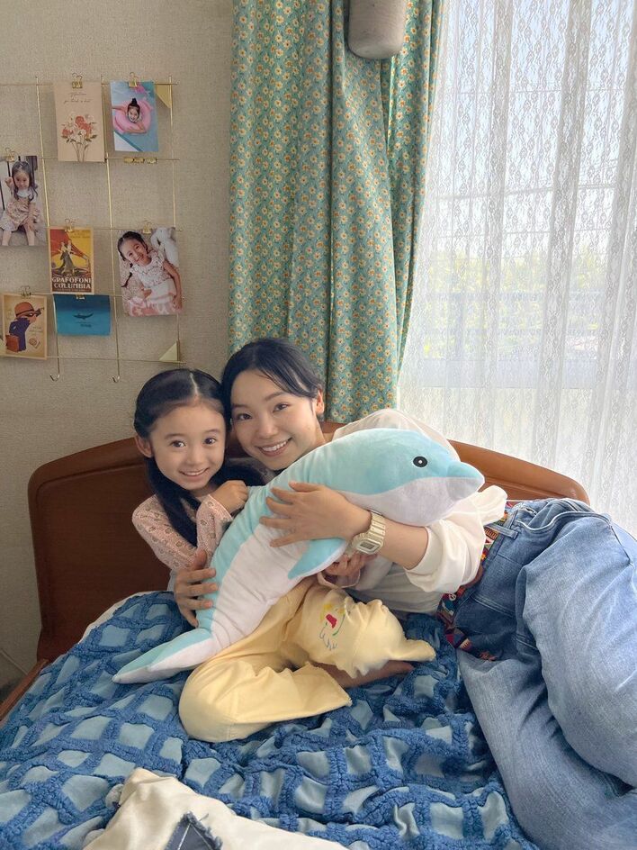 2人は仲良くベッドに座り、水色のイルカを抱きしめていました。