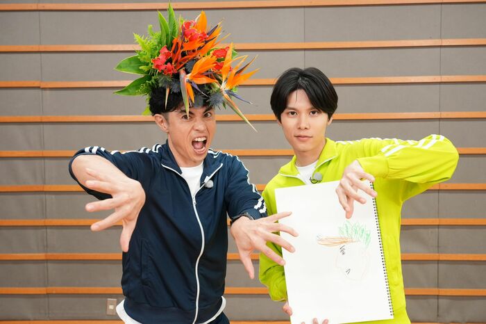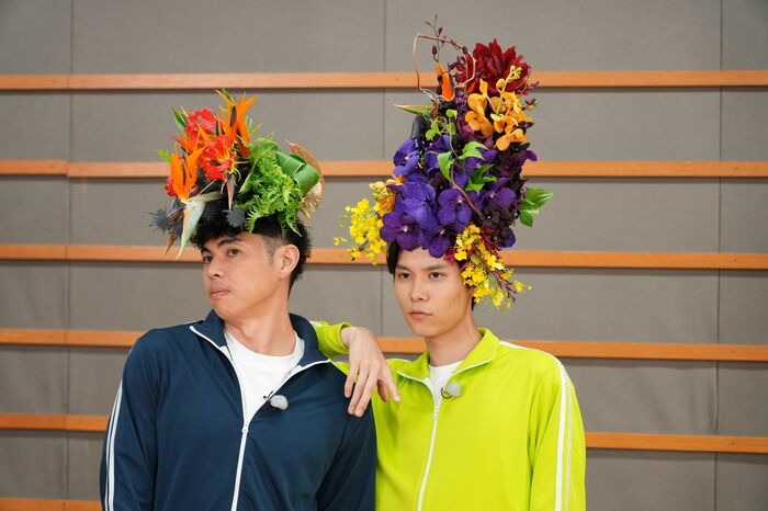 続いて、頭上にそびえつ「利久タワー」が完成した萩原さんも「色鮮やかですげー!」と大喜び。せっかくだから、ということで、「花結い」姿の写真を撮影することに。すっかりアートにハマった2人は、雰囲気たっぷりにポージング。撮影した写真は、今後番組グッズを展開するときに、特典として付ける予定だそうです。