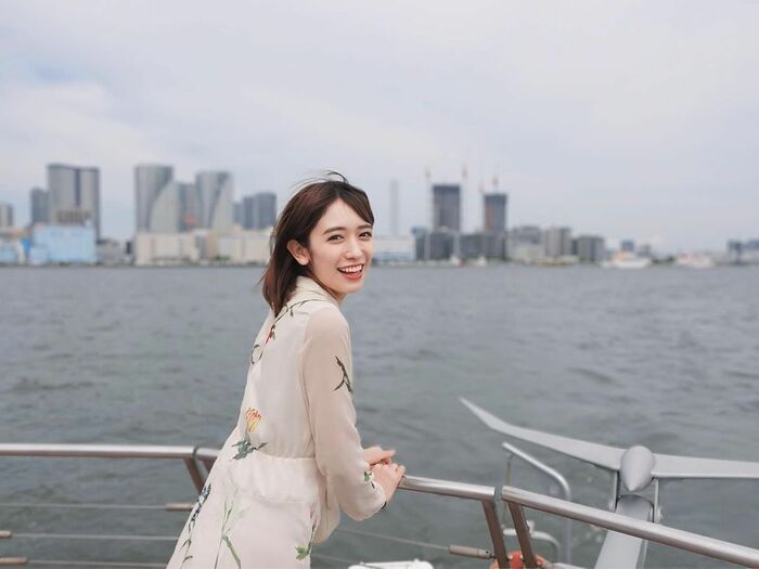 船の外で髪の毛を風になびかせながら、とびっきりの笑顔を見せる写真を投稿。