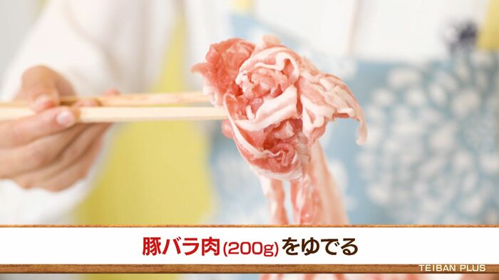 さらに、ここに豚バラ肉も入れてしゃぶしゃぶにします。これでスープに豚の旨味もプラス。と同時に具材用のおいしい味付き豚しゃぶもできちゃいます。