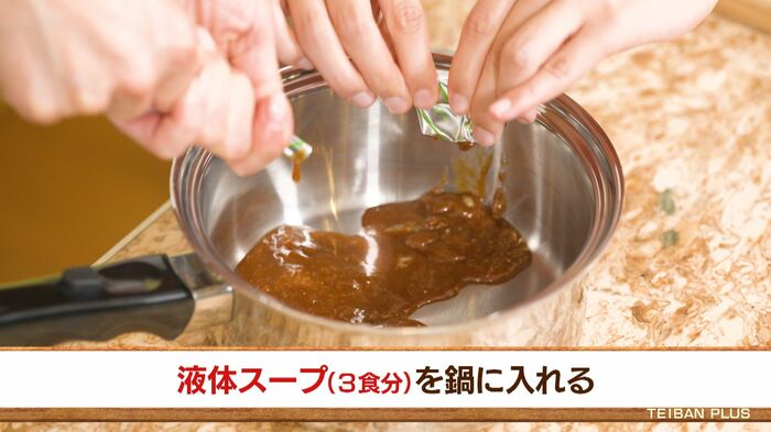まず、液体スープ3食分をすべて鍋に入れて、水、砂糖、すりごまを入れてよく混ぜ合わせます。