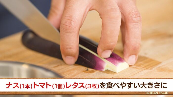 まずは、下準備としてナス、トマト、レタスを食べやすい大きさに切り、ナスを両面にこんがり焼き目がつくまで焼いておきます。