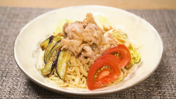 ・マルちゃん正麺 味噌味 3袋、豚バラしゃぶしゃぶ用  200g、ナス 1本、トマト 1個、レタス 3枚
