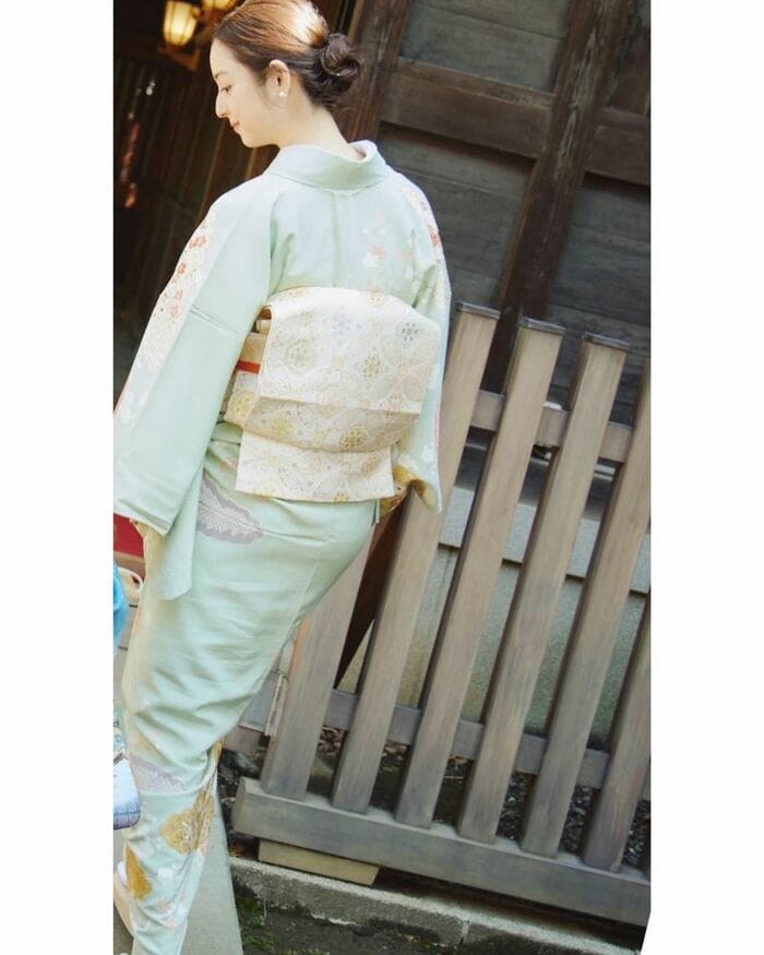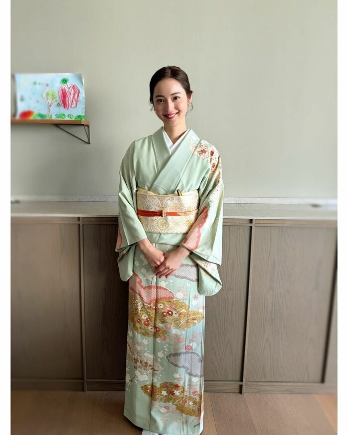 佐々木さんは「少し前になりますが、七五三のお参りで、ご祈祷を受けてきました!」と家族で七五三のお参りに行ってきたことを報告し、淡い緑色の着物姿を披露しました。