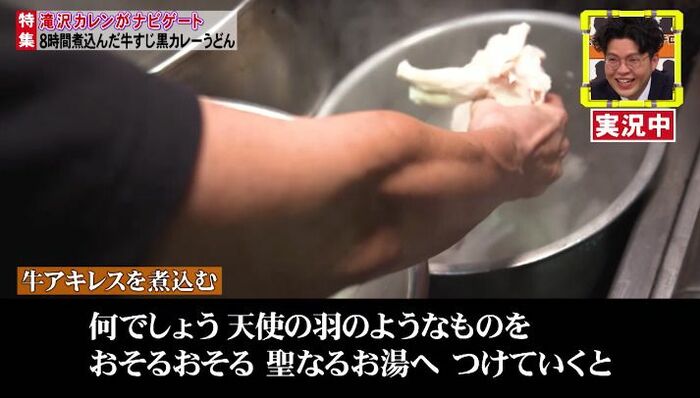 滝沢さんが牛アキレスの煮込みシーンを「天使の羽のようなものを聖なるお湯につける」と表現すると、出井さんは「なんでそんな美しい表現なの?」と丁寧にツッコミました。