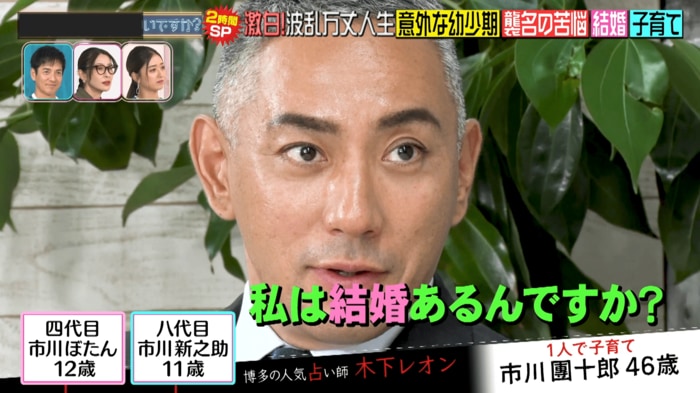 レオンさんが、新之助さんの将来のお相手は“顔のパーツがはっきりしている人”と占うと、團十郎さんは我が子の恋愛占いに触発されたのか、「私は結婚あるんですか?あまり意識したことないですけど」と質問。