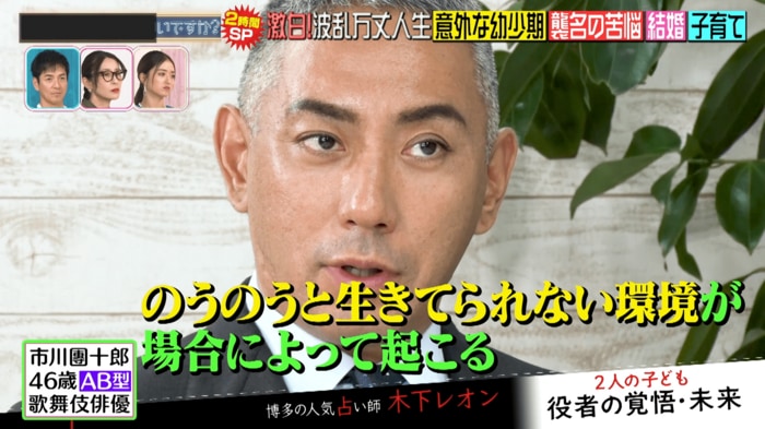 最後は、今後の運勢について鑑定。團十郎さんが「歌舞伎俳優じゃないとしたら、どんなビジネスが合ってる?」と聞くと、レオンさんは「起業家、実業家。会社の社長が合っている」と答えました。