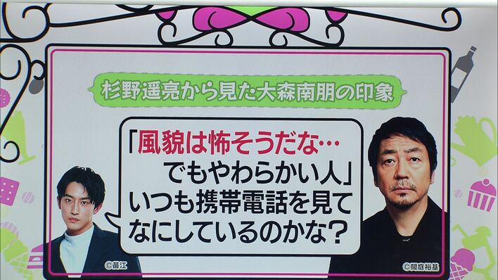 お互いの印象を聞かれると、杉野さんは「風貌は怖そうだな…。でもやわらかい人」とコメント。続けて、大森さんについて気になることを「いつも携帯電話を見て何しているのかな?」と明かしました。