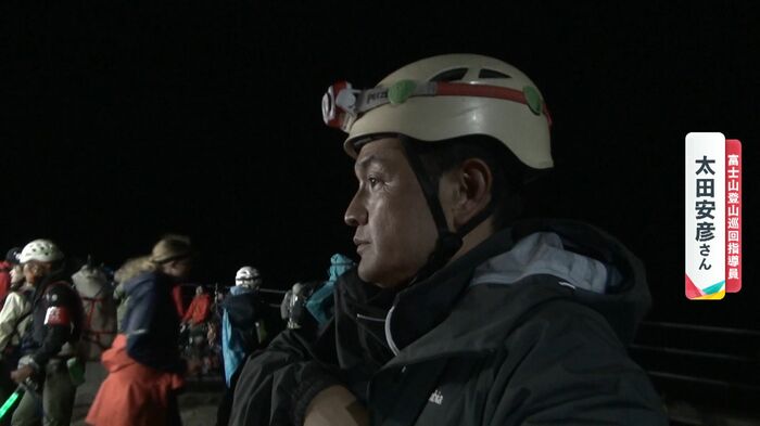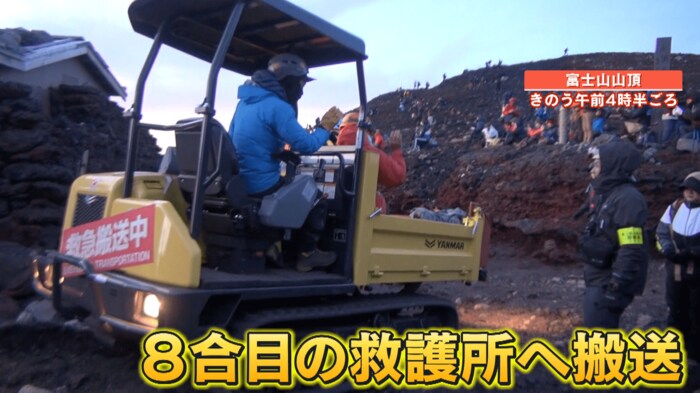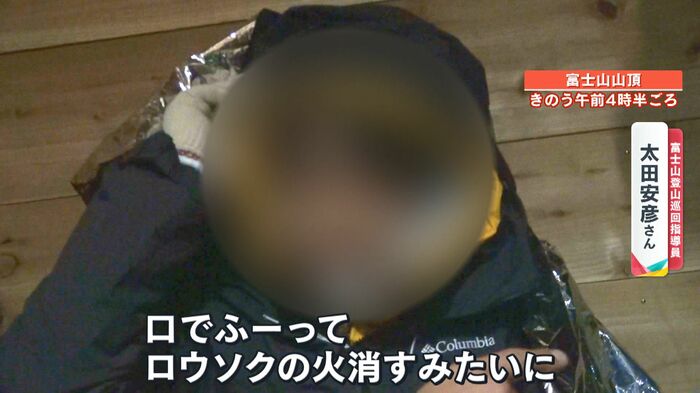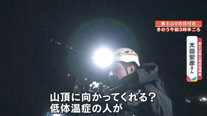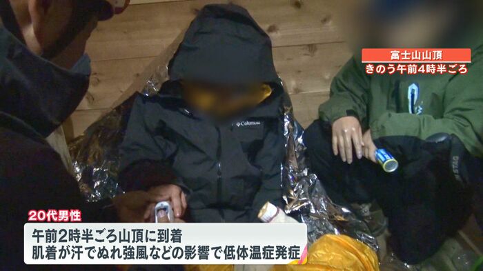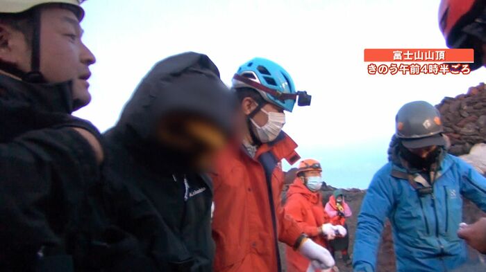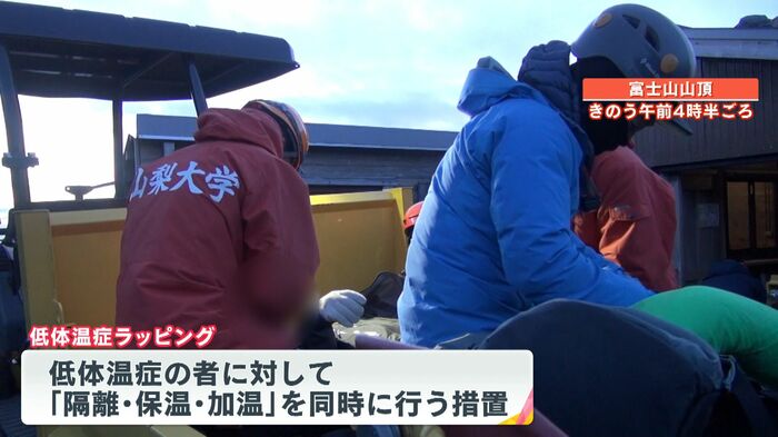4人がかりで男性を寝袋などで包む「低体温症ラッピング」と呼ばれる措置を施し、8合目の救護所に搬送されました。
